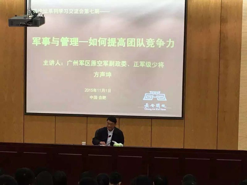 本期学习交流活动,集团公司邀请到了广州军区原空军副政委、正军级少将方声坤先生主讲。方政委以“军事与管理——如何提升团队的竞争力”为主题,结合自身多年的从军、治军经历,将管理的艺术娓娓道来,深入浅出地和聆听报告会的人员分享了智慧。