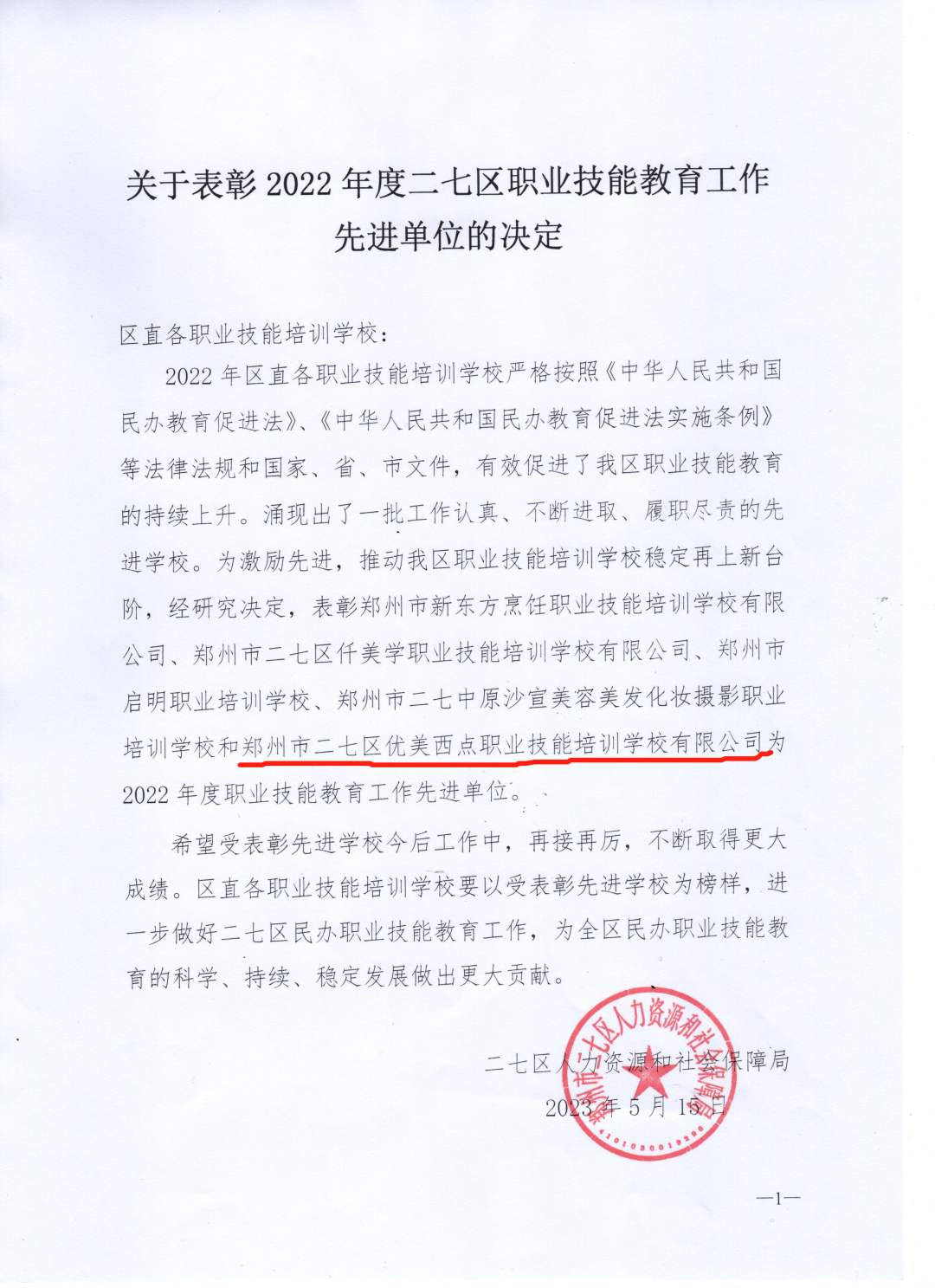 近日,郑州优美西点学校被郑州市二七区人社局授予“2022年度职业技能教育工作先进单位” 荣誉称号。
