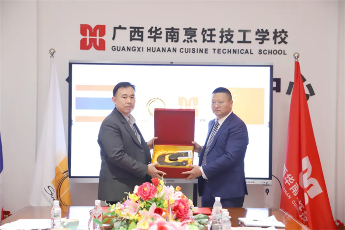 面对各位领导的热烈欢迎,塔南帕先生十分热情的用中文进行了回应,短短一句“感谢”,包含了整个泰国来访团的满腔情意。塔南帕先生拿出因疫情原因耽误了三年的信物——自主研发的烹饪香料及专业烹饪用具。塔南帕先生说道:这份信物我准备了三年,今年的再次合作,终于能赠予给华南烹饪院校,感触颇深。