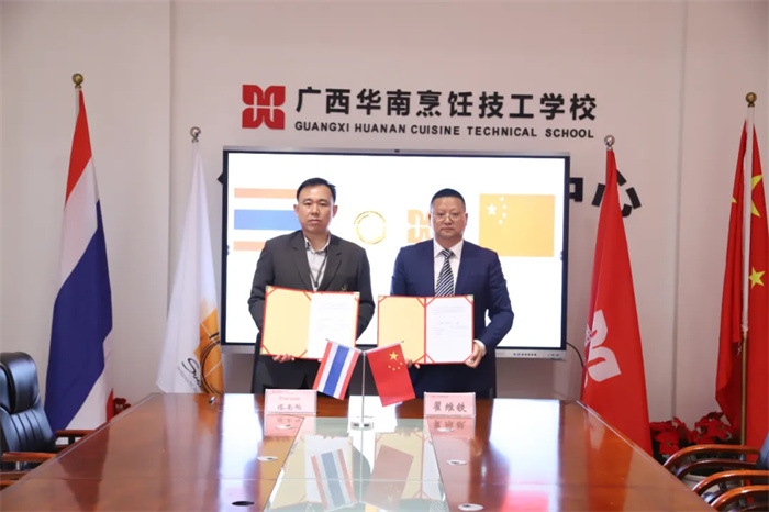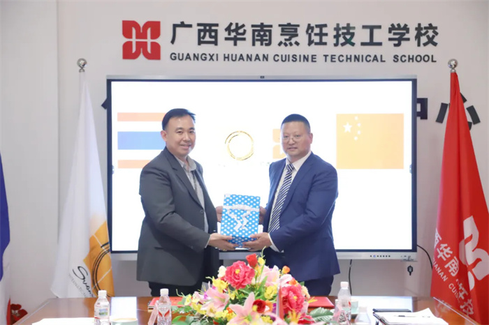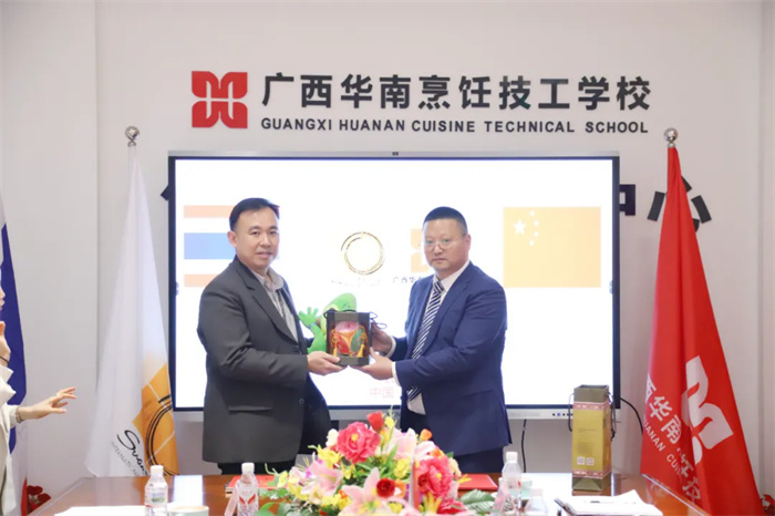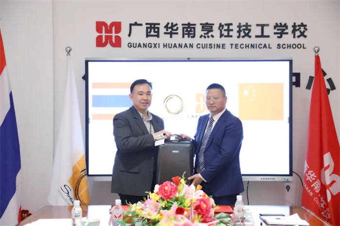 下午,中泰深化合作研讨会在广西华南烹饪技工学校东盟校区正式举办!长安开元教育集团学历事业部总经理翟维铁先生、广西华南烹饪技工学校校长闫冠英先生、泰国川登喜国际烹饪学校总经理塔南帕先生、生产厨房部主管彭贾南·席力沙派万先生、广西壮族自治区职业技能鉴定中心科长周雪林先生、广西-东盟经济技术开发区招商局局长蔡翔先生、广西华南烹饪技工学校校长助理梁精华先生出席研讨会,致力于发展两国传统烹饪技术、分享两国特色产品制作工艺,建立深度的国际合作交流。