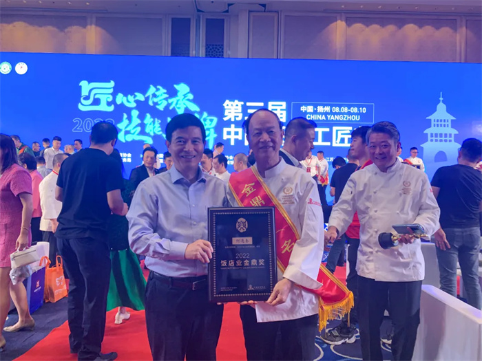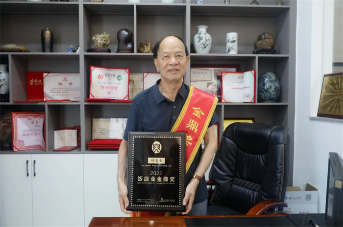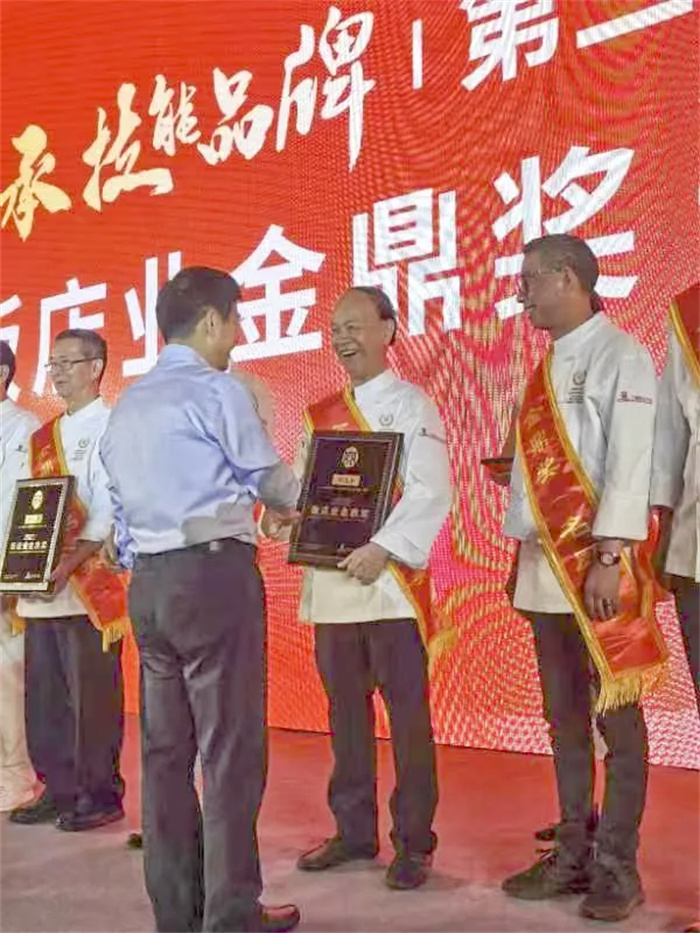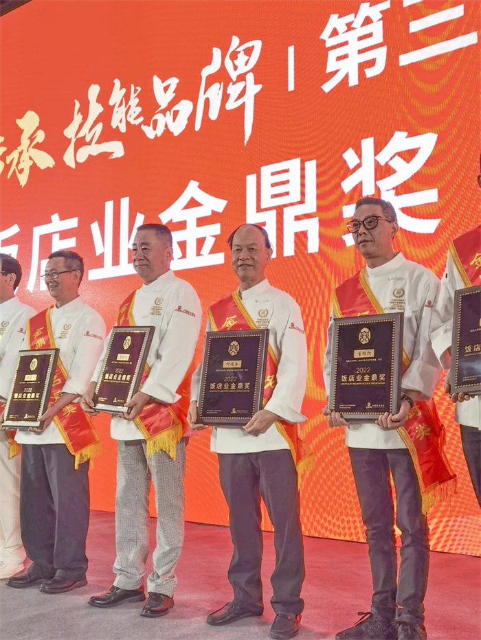 注册元老级中国烹饪大师、我校终身客座教授何逸奎经过上级领导层层审批,最终凭借在餐饮界的造诣和精湛的厨艺被中国饭店业协会授予2022饭店业“金鼎奖”荣誉。