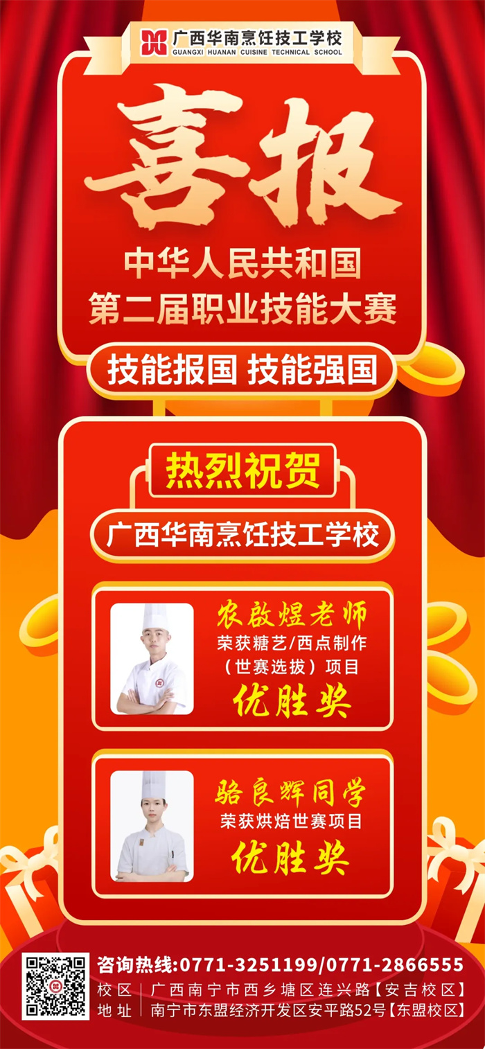 中华人民共和国第二届职业技能大赛9月19日在天津圆满闭幕。广西华南烹饪技工学校选手在赛场上表现出色,农啟煜老师荣获糖艺/西点制作(世赛选拔)项目优胜奖;骆良辉同学荣获烘焙世赛项目优胜奖!