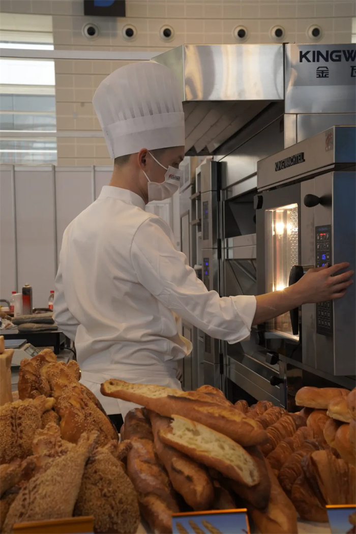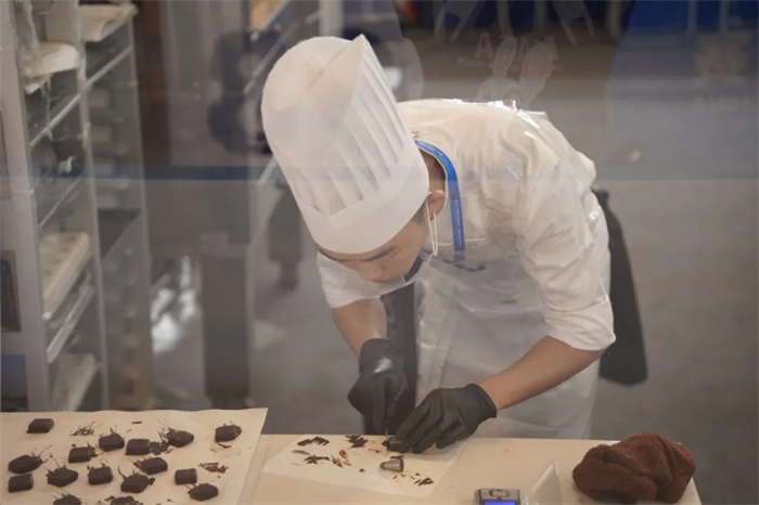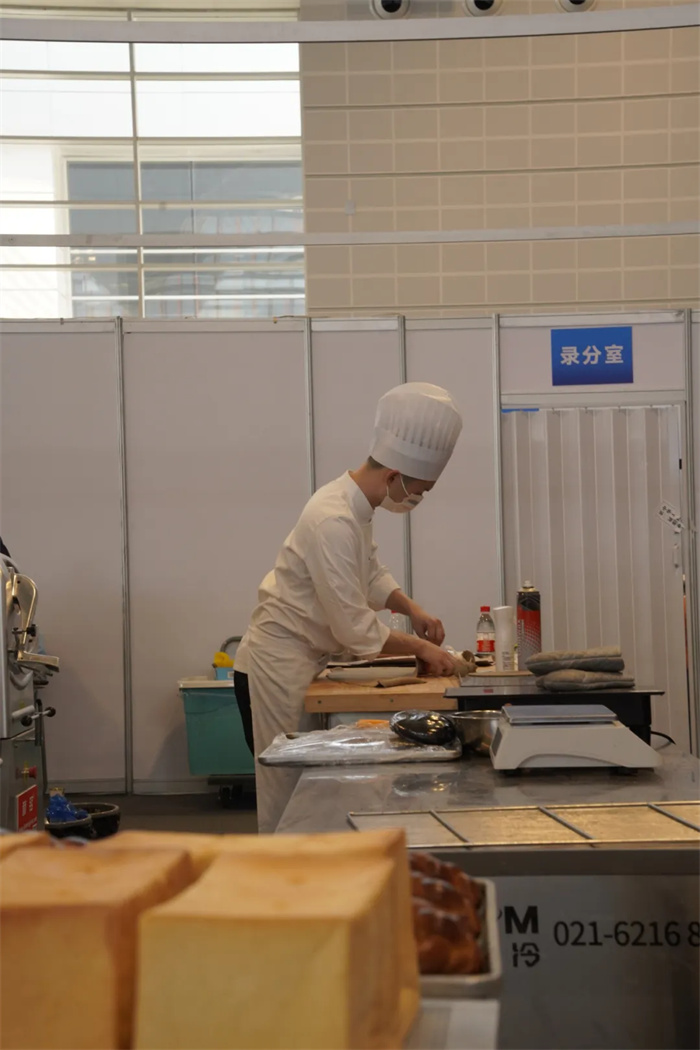 另一边,我校烘焙(国赛)选手黄庆安老师也在认真地进行比赛。他们仿佛都置身于独立的空间,心无旁鹜地与时间赛跑,快速而精准的动作,展现出他们对烘焙工艺的完美掌握,每一道工序都要求精益求精,执着的表情凝聚在他们的脸上。