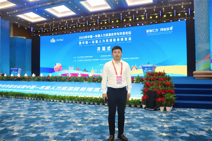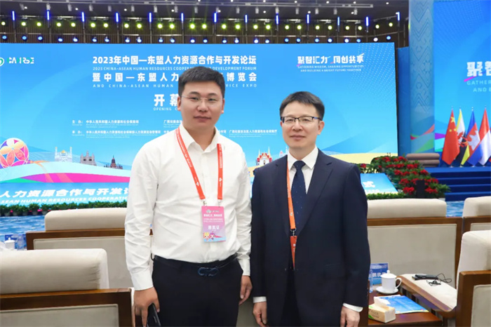 2023年11月3日-4日,由人力资源社会保障部、广西壮族自治区人民政府主办,人力资源社会保障部人力资源流动管理司、人力资源社会保障部国际合作司、广西壮族自治区人力资源和社会保障厅承办的中国一东盟人力资源合作与开发论坛暨中国—东盟人力资源服务博览会(简称人博会)在南宁国际会展中心拉开序幕。安徽长安开元教育学历事业部总经理助理、广西院校校长闫冠英先生受邀出席了开幕式现场,并与自治区人社厅党组成员、副厅长辛卫红合影。