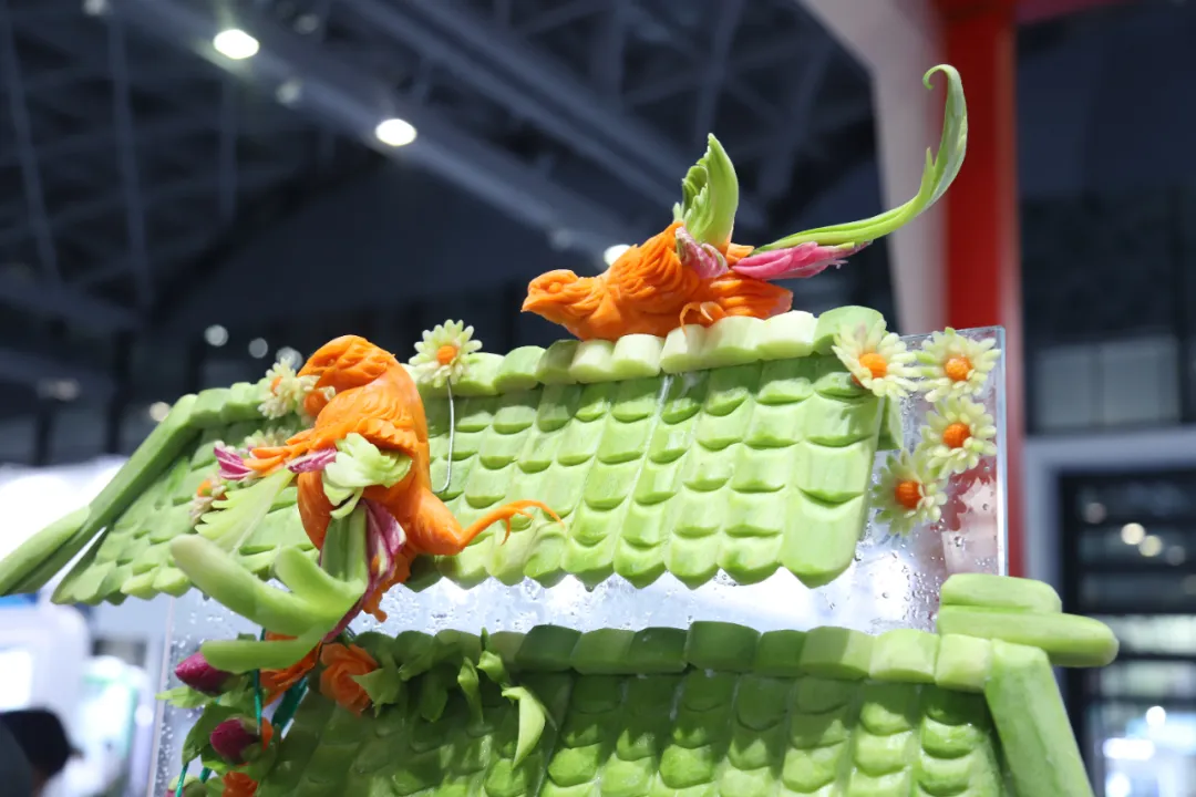 作品展示区为现场嘉宾们带来了一场美食艺术的盛宴,分别展示了中餐、泰国菜、雕刻、果酱画、糖艺、创意蛋糕、艺术面包等作品,每一款作品都巧夺天工、惟妙惟肖,吸引着嘉宾们驻足拍照。