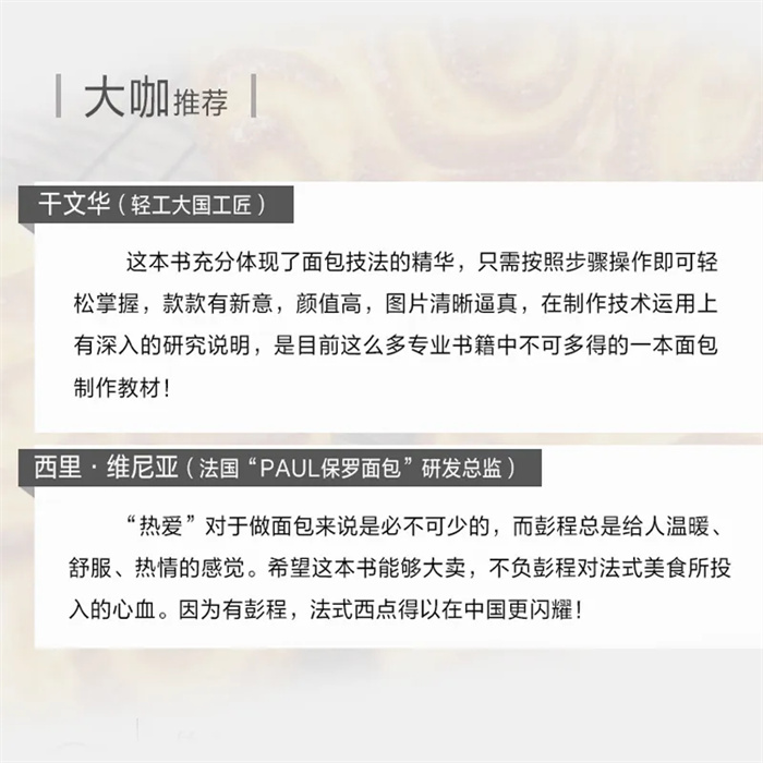此外,这本书也得到了轻工大国工匠干文华、法国“PAUL保罗面包”研发总监西里·维尼亚的倾情推荐。