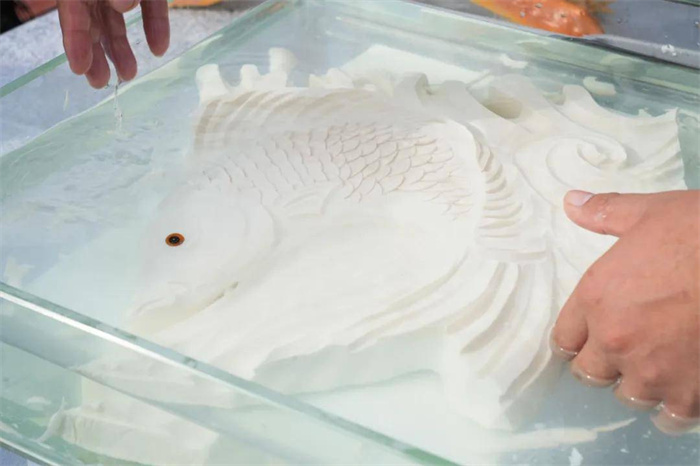 中国食品雕刻历史源远流长,更是被誉为刀尖上的琦葩,现场,我校中烹教师展示的中华绝技——豆腐雕刻更是令人拍手称绝!一盆清水、一块方形的嫩豆腐以及一把锐利的刻刀,只见他心无旁骛,“稳、准、快、柔”一气呵成,最终呈现了精致的【锦鲤】作品,一勾一勒,巧夺天工。
