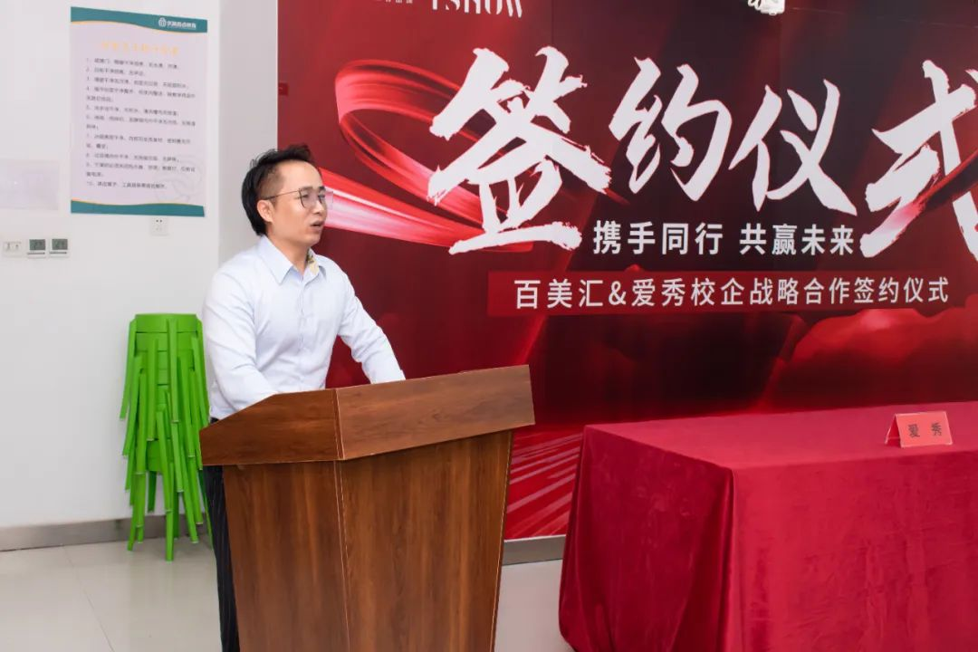 紧接着,爱秀企业副总经理唐学军先生作为企业代表发言:他表示百美汇是一所专业培养美业技术型人才的培训学校,很高兴可以与百美汇成为战略合作伙伴,也诚挚地欢迎每一位学成毕业后的百美汇学员加入爱秀企业,以精湛技术,圆梦美业未来。