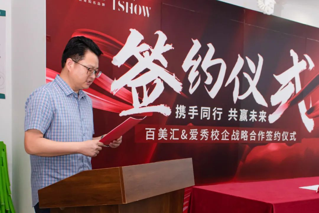 郑州百美汇学校校长王成先生、爱秀企业代表唐学军副总经理与现场特邀嘉宾,出席了本次校企签约爱秀冠名班发布会。