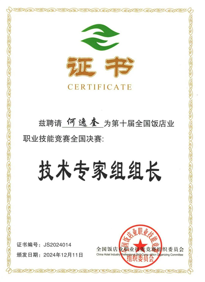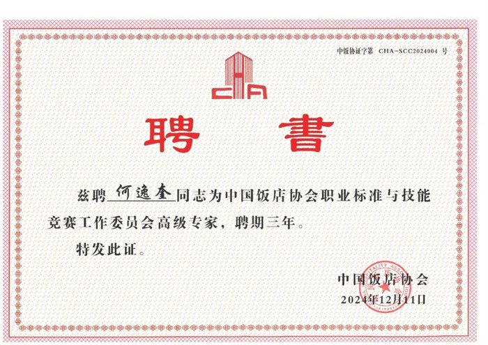 何逸奎大师还多次受邀参与国内外重要餐饮赛事的评判与指导工作,并对餐饮行业的职业标准与技能竟赛有着独到的见解和深刻的认知,此次被【中国饭店协会职业标准与技能竞赛工作委员会】聘任为高级专家及被【第十届全国饭店业职业技能竞赛全国决赛】聘任为技术专家组组长,无疑是对他多年来为餐饮行业所做努力的最好肯定,也进一步凸显了何逸奎大师在烹饪技艺及行业评判方面的权威地位。