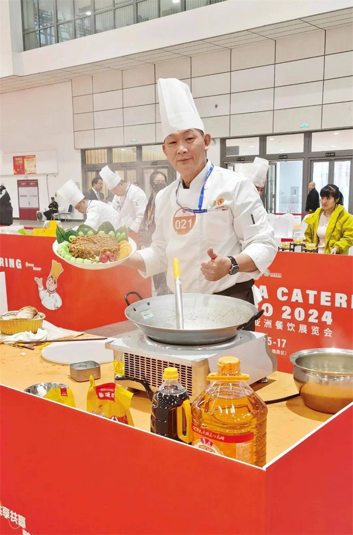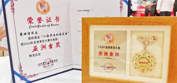 现场,资深级中国烹饪大师、我校终身烹饪实战专家蒙世涛大师制作了特色菜“八渡笋丝扣虎皮肉”备受好评,并凭借卓越的厨艺和独特的创意,在大赛中脱颖而出,一举斩获个人亚洲金奖,为我校烹饪专业发展书写了浓墨重彩的一笔,也在亚洲烹饪界展现了我校的风采与技能实力。