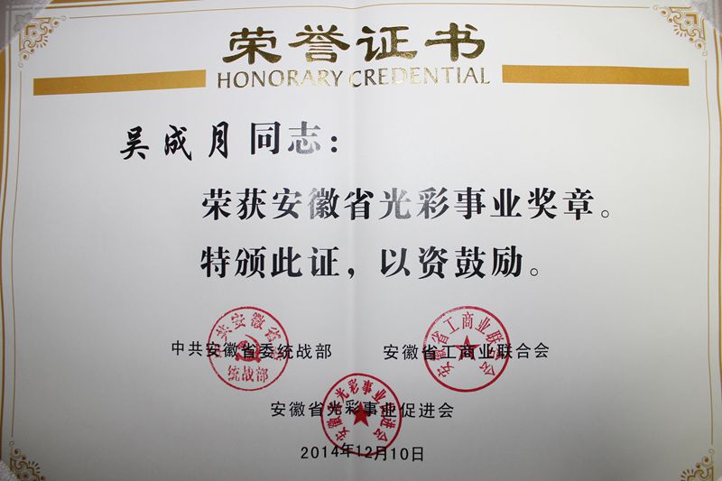 12月9日至10日,安徽省光彩事业促进会第四次会员代表大会暨全省第四届优秀建设者表彰大会在合肥稻香楼宾馆召开。安徽省委常委、省委统战部部长沈素琍,省人大常委会副主任宋卫平,省政府副省长杨振超,省政协副主席、省工商联主席李卫华,省委统战部副部长、省工商联党组书记徐发成,省工商联副主席耿学梅等领导出席会议。集团公司董事长参加表彰会,获“安徽省光彩事业先进个人奖章”。