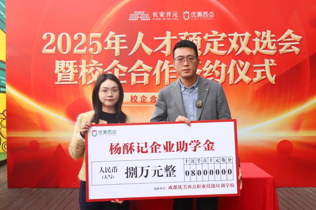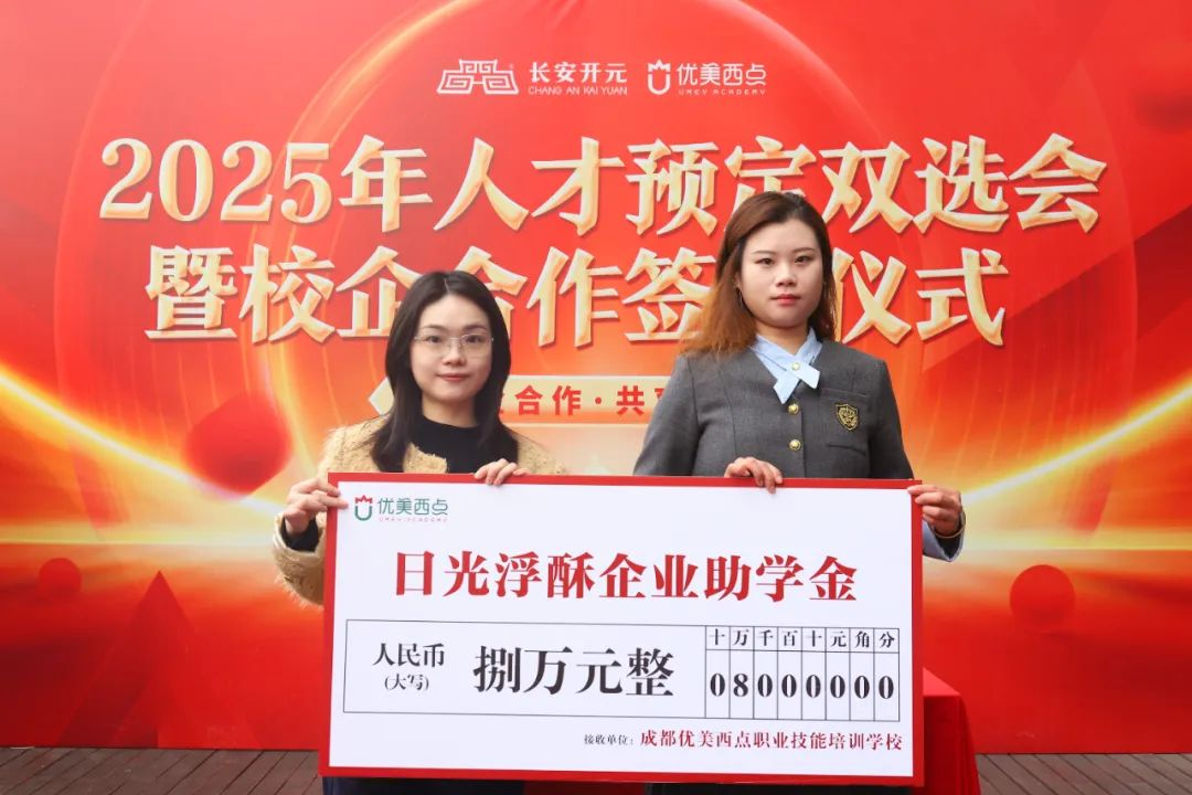 签约会最后环节,校企合作单位针对就读于成都优美西点学校就业定向班的学生分别提供100000元、80000元的企业助学金,助力同学们实现烘焙梦想!