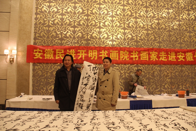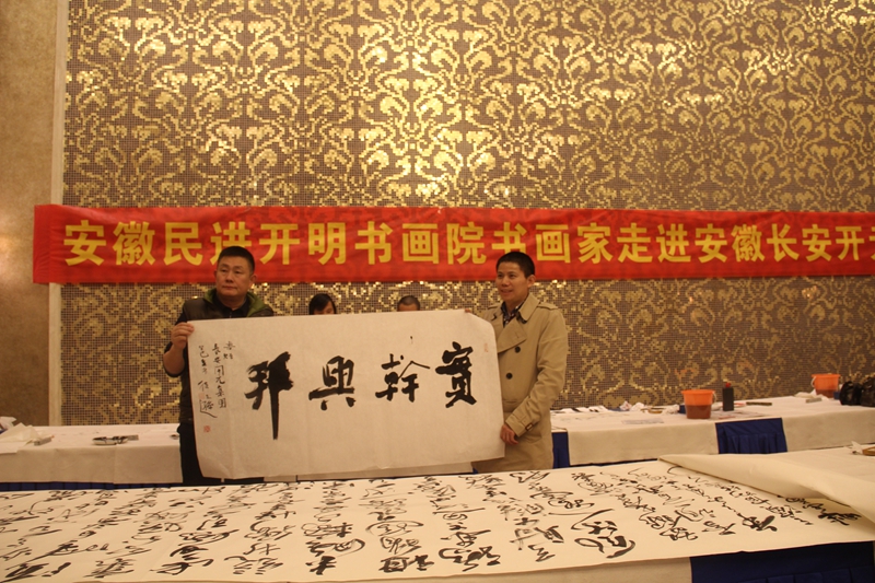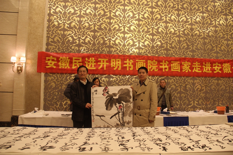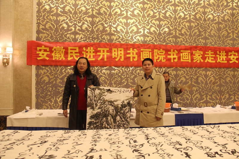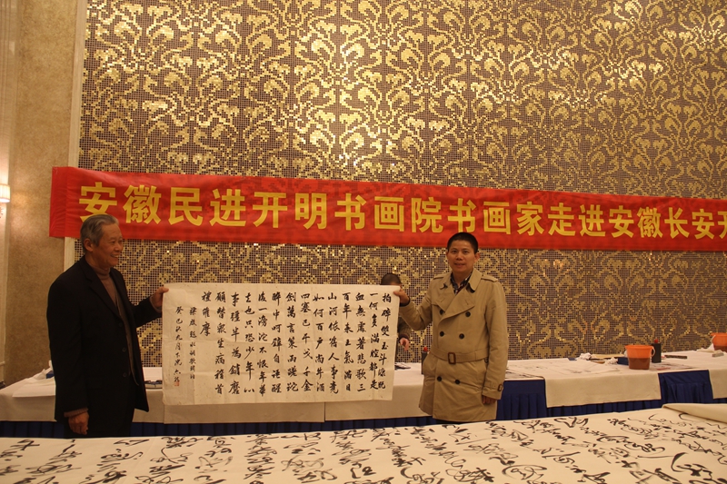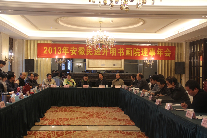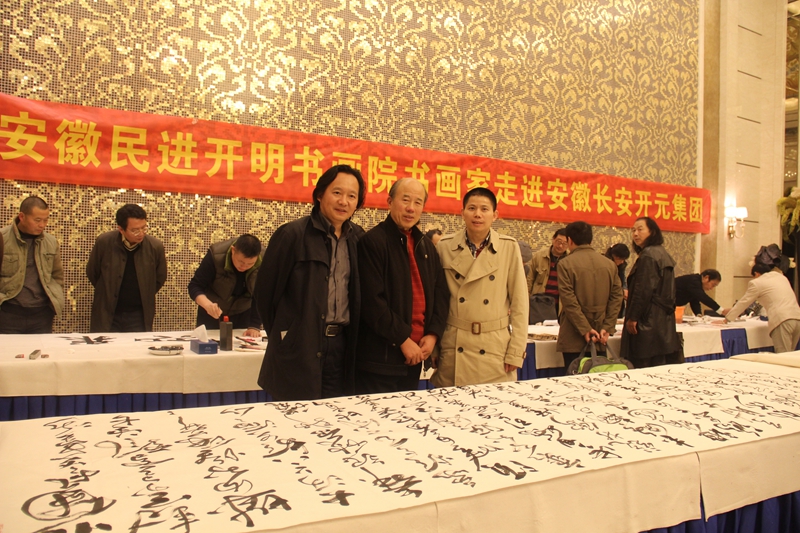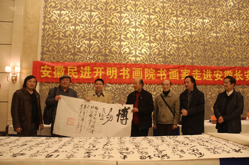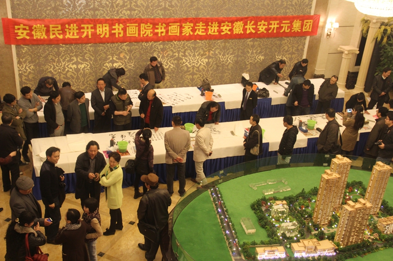 安徽民进开明书画院2013年理事年会讨论了书画院相关工作。随后,举行了书画笔会活动,书画家们挥毫泼墨,创作书画作品,各位书画家还分别向长安开元集团公司捐赠了各自创作的书画作品,并合影留念。